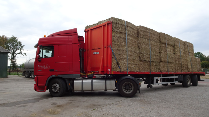 We beschikken over platte wagen om balen te laden en een loader met balenklem.